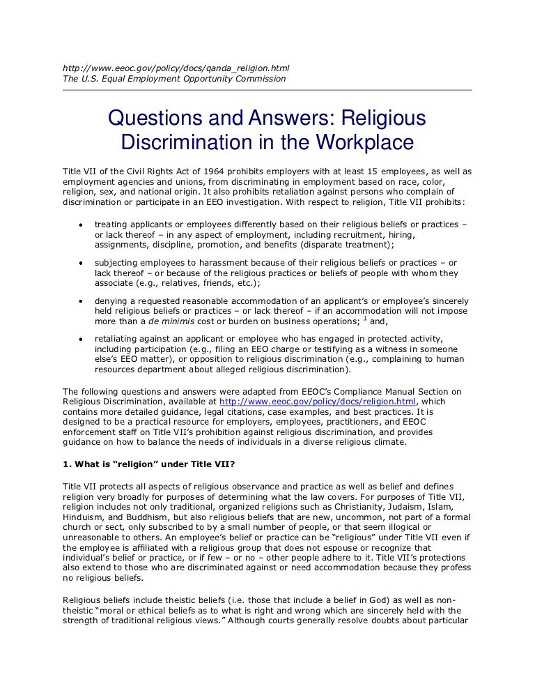 Nov 02, · Making employment dependent on religious activity is also religious discrimination For example, requiring employees to attend religious services (or prohibiting them from attending religious services) 1 Religious discrimination is prohibited by Title VII of the Civil Rights Act of l964 According to this Act, employers may not hire, fire, or segregate employees based on religiousUne discrimination religieuse intenable Norman Spector 6 septembre 07 Chronique Chroniques;Many translated example sentences containing "conviction religieuse" – EnglishFrench dictionary and search engine for English translations dans les citations que je vous ai données sussexcirclecom sussexcirclecom It is the forms of discrimination based on origin, race, language and religion